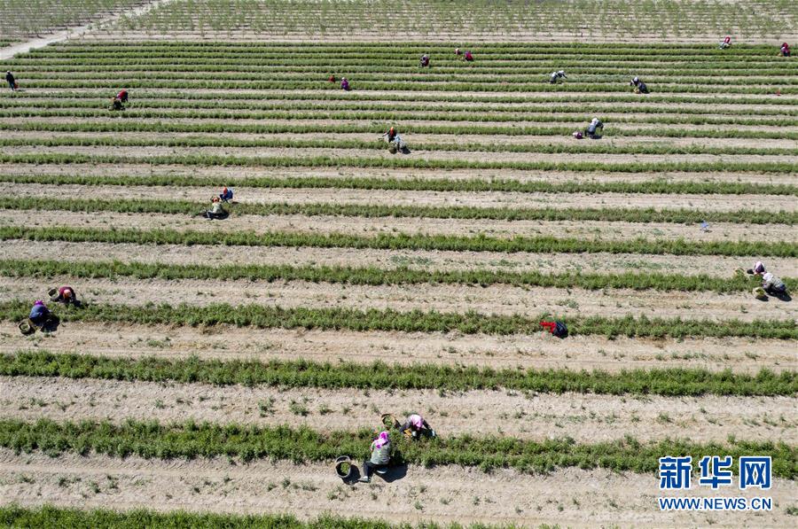 5月11日,采茶工在寧夏百瑞源賀蘭山基地采摘枸杞芽茶(無(wú)人機(jī)照片)。當(dāng)日,寧夏百瑞源賀蘭山基地枸杞芽茶全面進(jìn)入采摘季。據(jù)了解,該基地茶園面積300余畝,助力附近200多名農(nóng)民就業(yè)增收。新華社記者楊植森攝