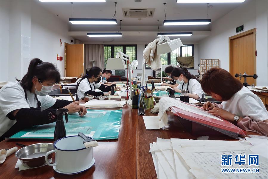 5月13日,古籍修復(fù)師在對(duì)書(shū)畫(huà)作品進(jìn)行裝裱操作。天一閣藏品修復(fù)部目前有修復(fù)師14人,每年約修復(fù)古籍14000余頁(yè)。據(jù)介紹,修復(fù)一冊(cè)古籍通常需要1至2個(gè)月,有的甚至需要1年以上。新華社記者鄭夢(mèng)雨攝