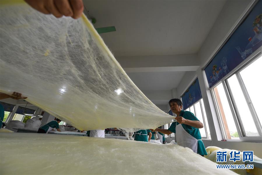 5月27日,在位于桐鄉(xiāng)市洲泉鎮(zhèn)的浙江蠶緣家紡股份有限公司內(nèi),工作人員把加工好的黃金蠶絲進行“拉絲綿”工序,準(zhǔn)備用于制作蠶絲被。新華社記者徐昱攝