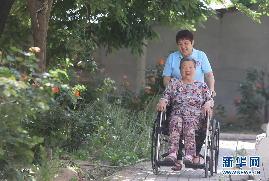 6月1日,在正定縣塔元莊村勁松老年公寓,工作人員推著一位老人在庭院散心。