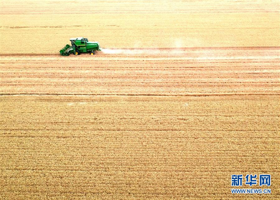 6月2日,在河南省黃泛區(qū)農(nóng)場九分場的麥田里,農(nóng)民操作大型收割機(jī)收獲小麥(無人機(jī)照片)。新華社記者李嘉南攝。