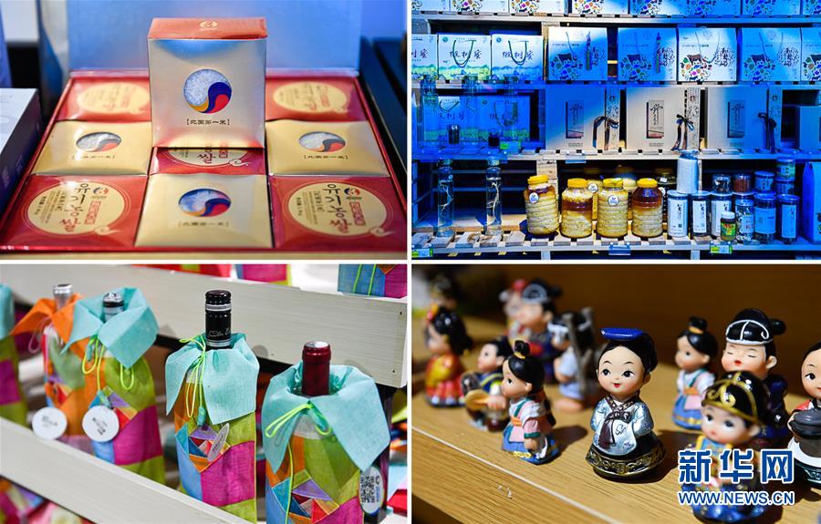 在延邊朝鮮族自治州和龍市“金達萊絲路”電商平臺實體店內拍攝的帶有朝鮮族元素包裝的農(nóng)特產(chǎn)品及文創(chuàng)產(chǎn)品(拼版照片,5月7日攝)。新華社記者許暢攝。