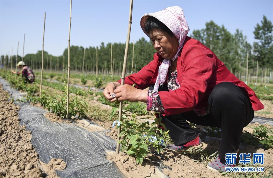 6月3日,村民在深州市魏家橋鎮(zhèn)金銀花種植扶貧基地管理金銀花樹。今年以來,河北省深州市圍繞決勝全面小康、決戰(zhàn)脫貧攻堅任務(wù)目標(biāo),在推進(jìn)產(chǎn)業(yè)扶貧的過程中注重激發(fā)內(nèi)生動力,通過電商扶貧、扶貧車間、特色種植養(yǎng)殖等多種形式,提升自我“造血”功能,提高貧困群眾受益度。新華社記者李曉果攝。