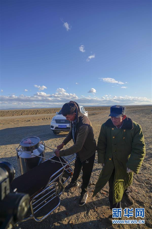 在吉木乃縣萬駝園內(nèi),牧民米拉木別克·阿依提克(右)在兒子的幫助下準備騎著摩托車去交駝奶(6月21日攝)。新華社記者趙戈攝