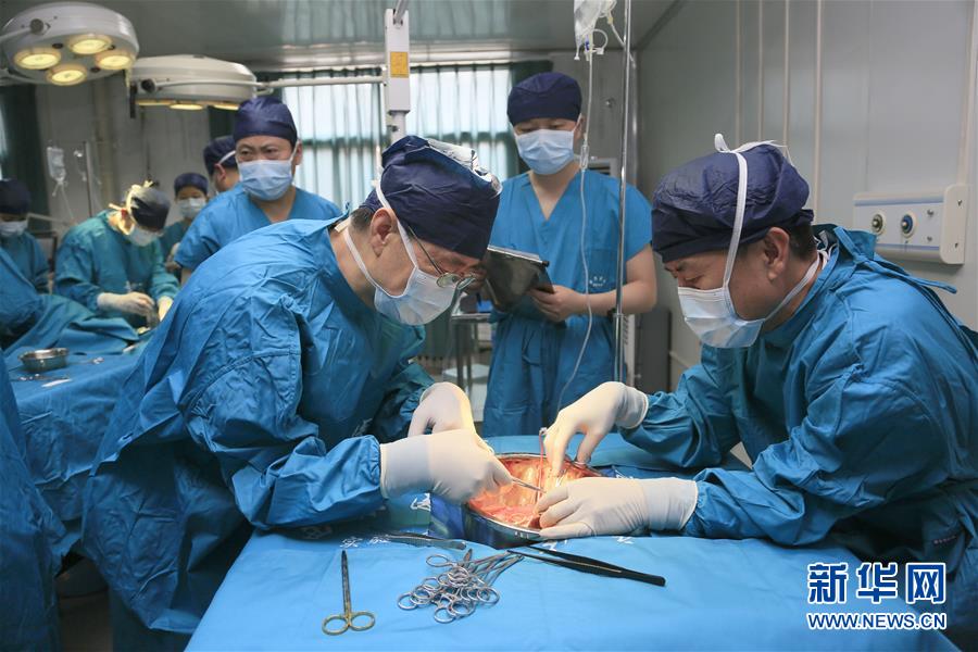 豬-猴異種肝心腎器官移植手術(shù)現(xiàn)場(6月13日攝)。日前,多基因編輯豬-恒河猴異種肝、心、腎器官移植在位于陜西西安的空軍軍醫(yī)大學(xué)西京醫(yī)院順利實施。研究團隊使用豬內(nèi)源性逆轉(zhuǎn)錄病毒(PERV)敲除的13個基因修飾豬作為供體,將一個供體豬的肝、心、腎分別移植給3只恒河猴受體。目前,移植肝和對應(yīng)的受體猴已存活16天,突破國際上的豬-猴輔助性肝移植最長存活時間記錄。這項研究有助于未來解決器官短缺造成的臨床器官移植發(fā)展受限難題。新華社發(fā)(張懿楠攝)