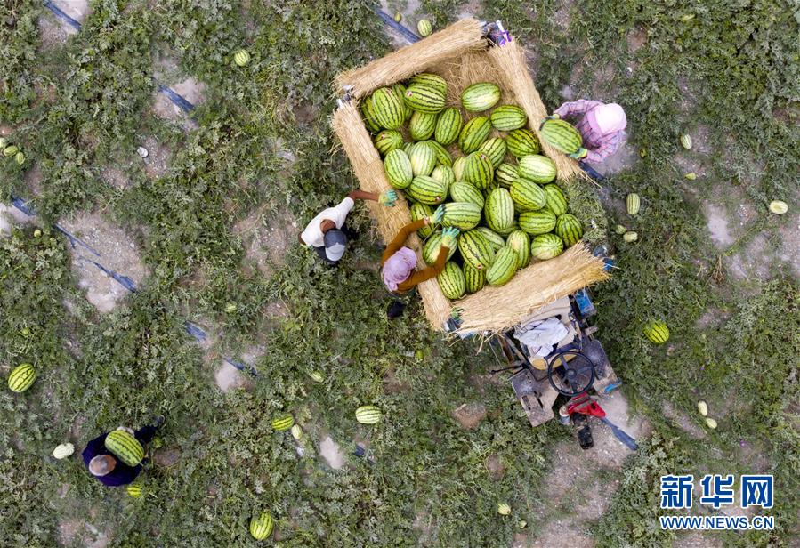 7月16日,在寧夏中衛(wèi)市香山鄉(xiāng)硒砂瓜萬畝示范基地,瓜農(nóng)將采收的西瓜裝車(無人機照片)。近日,寧夏中衛(wèi)市迎來硒砂瓜豐收季。硒砂瓜是中衛(wèi)市的特色農(nóng)產(chǎn)品,近年來,當(dāng)?shù)夭扇〖夹g(shù)創(chuàng)新、規(guī)?;N植、休耕輪作等多項舉措,讓硒砂瓜種植成為當(dāng)?shù)剞r(nóng)民增收致富的重要產(chǎn)業(yè)。據(jù)了解,今年中衛(wèi)市硒砂瓜種植面積為69.7萬畝。新華社記者楊植森攝