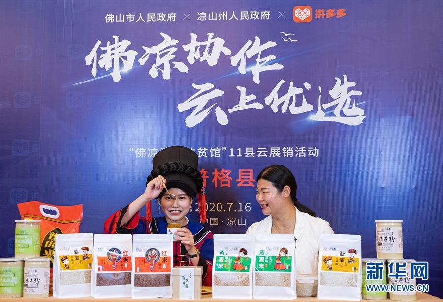 7月18日,在涼山州昭覺縣粵川東西部扶貧協(xié)作項(xiàng)目產(chǎn)業(yè)園,昭覺縣副縣長徐航(右)和王涼萍(左)在直播活動中向網(wǎng)友推薦產(chǎn)業(yè)園出產(chǎn)的水果番茄。7月16日至18日,來自四川省涼山彝族自治州、廣東省佛山市的十余名干部攜手大涼山網(wǎng)絡(luò)主播,走進(jìn)電商“云展銷”直播間和粵川東西部扶貧協(xié)作項(xiàng)目產(chǎn)業(yè)園,為涼山11個縣的農(nóng)特產(chǎn)品直播“帶貨”,通過電商銷售帶動消費(fèi)扶貧。新華社記者江宏景攝