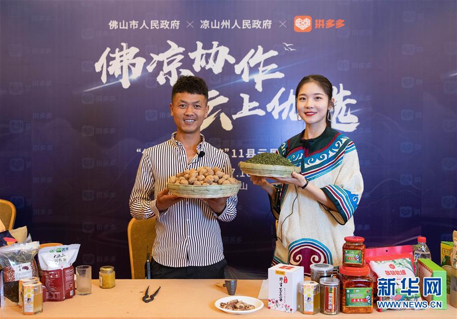 7月18日,在涼山州昭覺縣粵川東西部扶貧協(xié)作項(xiàng)目產(chǎn)業(yè)園,昭覺縣縣長赫紹洪(右)在直播活動中向網(wǎng)友推薦農(nóng)特產(chǎn)品。新華社記者江宏景攝