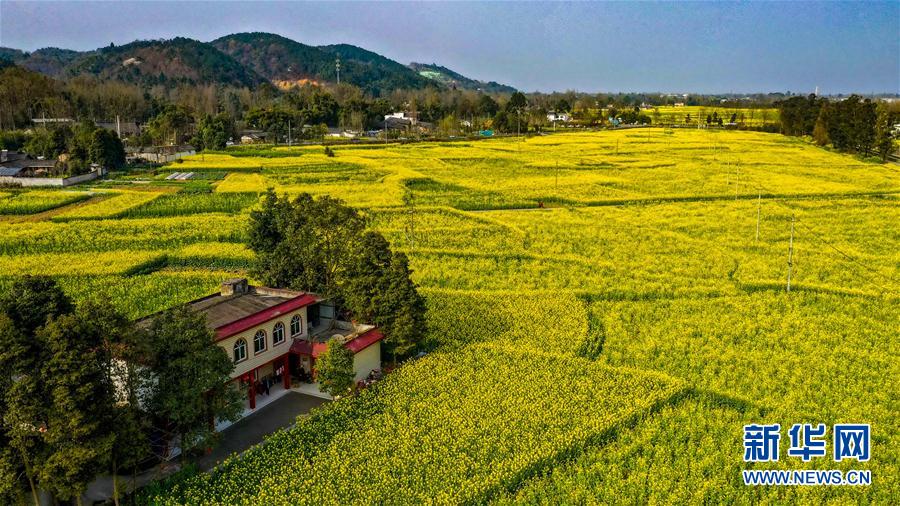 這是2月25日在四川省崇州市重慶路拍攝的油菜花田(無人機照片)。新華社記者王曦攝