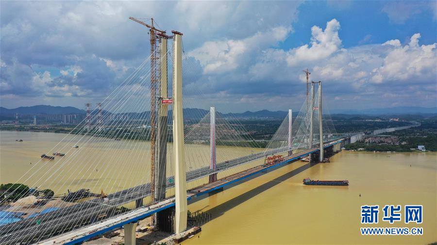 7月22日拍攝的廣州南沙港鐵路跨西江特大斜拉橋最后一組斜拉索吊裝現(xiàn)場(無人機照片)。新華社記者劉大偉攝