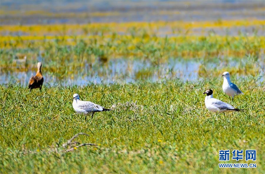 7月28日,灰雁和遺鷗在桃力廟—阿拉善灣海子覓食。鄂爾多斯?jié)竦匚挥趲觳箭R沙漠、毛烏素沙地接壤地帶,2002年被列入國際重要濕地名錄。從2006年開始,由于濕地湖面萎縮、湖心島消失,在此筑巢繁殖的世界瀕危物種遺鷗幾近消失。近年來,當?shù)夭扇《喾N治理措施,濕地生態(tài)環(huán)境逐步好轉。2019年起,濕地內的桃力廟—阿拉善灣海子迎來遺鷗大規(guī)?!盎貧w”。如今,40多種鳥類在此棲息,鄂爾多斯?jié)竦刂匦鲁蔀轼B類的樂園。新華社記者彭源攝
