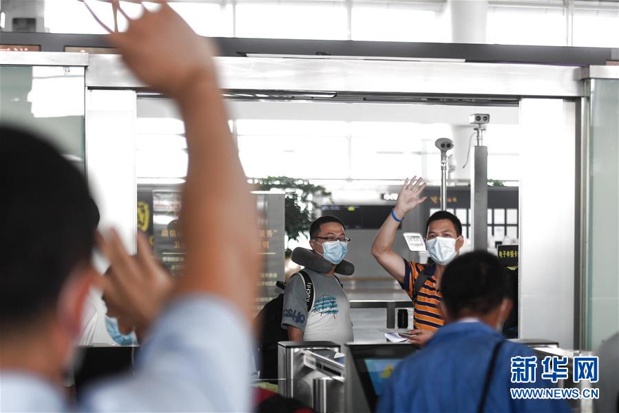 7月29日,在杭州蕭山國際機(jī)場(chǎng),電力工程技術(shù)人員走入安檢通道后與送行人員揮手告別。當(dāng)日,中國能源建設(shè)集團(tuán)浙江火電建設(shè)有限公司的113名電力工程技術(shù)人員在杭州蕭山國際機(jī)場(chǎng)集結(jié),啟程飛赴印度尼西亞首都雅加達(dá)。他們將重新投入到印尼多個(gè)“一帶一路”重點(diǎn)工程的建設(shè)中。新華社記者黃宗治攝