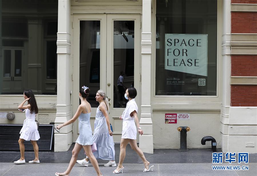 7月30日,在美國紐約蘇豪商業(yè)區(qū),人們從一家招租的店面旁走過。美國商務部30日公布的首次預估數據顯示,受新冠疫情導致經濟大面積“停擺”和消費停滯拖累,今年第二季度美國實際國內生產總值(GDP)按年率計算下滑32.9%,創(chuàng)1947年有記錄以來最大降幅。新華社記者王迎攝