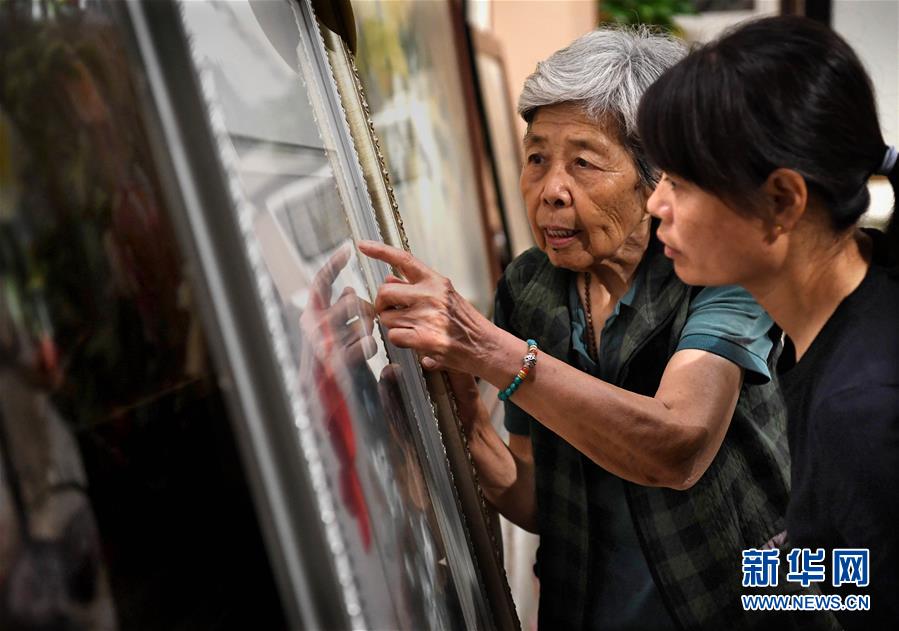 在開封市素花宋繡工藝有限公司的展示館里,王素花在觀看自己的刺繡作品(7月30日攝)。新華社記者李嘉南攝