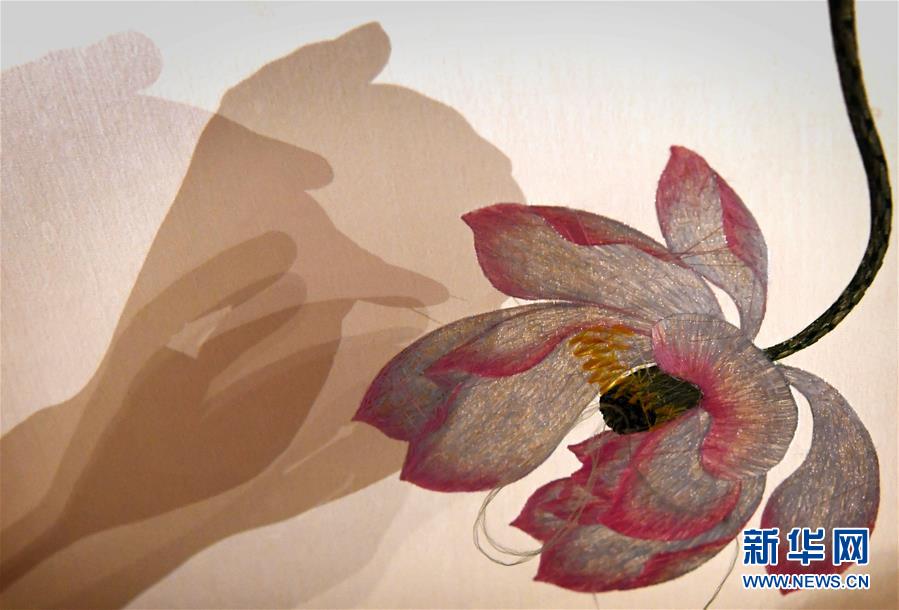 這是開封市素花宋繡工藝有限公司展示館的一幅繡品局部(7月30日攝)。新華社記者李嘉南攝