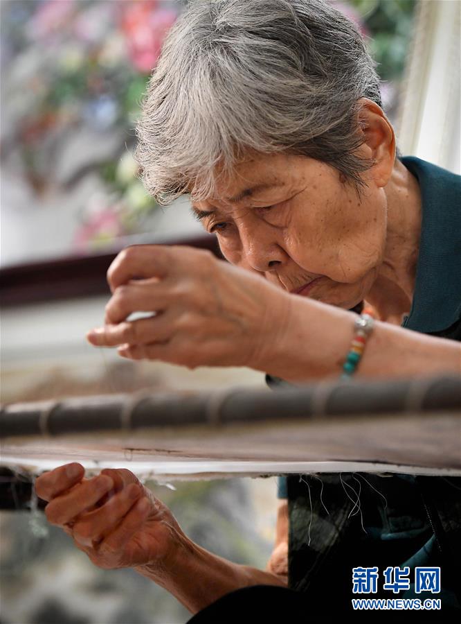 在開封市素花宋繡工藝有限公司的展示館里,王素花在劈線(7月30日攝)。新華社記者李安攝
