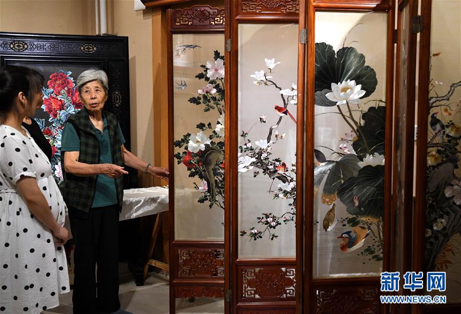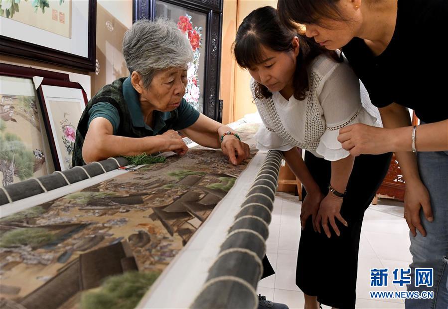 在開封市素花宋繡工藝有限公司的展示館里,王素花向徒弟劉冬紅講解刺繡作品上的難點(7月30日攝)。新華社記者李安攝