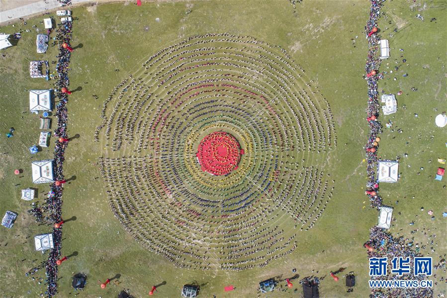 西藏首屆弦子舞展演現(xiàn)場(8月7日攝,無人機照片)。當日,西藏首屆弦子舞展演在昌都市芒康縣舉行。眾多演員同臺獻藝,表演國家級非物質文化遺產弦子舞,吸引西藏各地的群眾前來觀看。新華社記者孫非攝