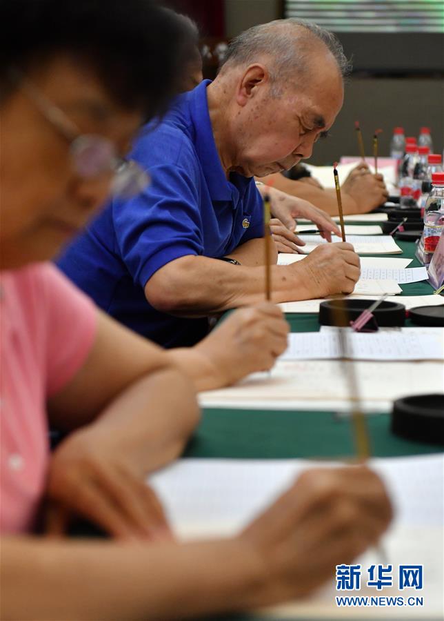 8月13日,陜西師范大學退休教師韓月娥(左二)等書寫錄取通知書。當日,陜西師范大學2020年手寫錄取通知書正式開筆。該校自2007年起采用毛筆書寫錄取通知書的方式,為新生傳遞佳音。今年,學校十余位退休教師、在職教師、校友代表等書法愛好者將為約4500名新錄取的本科生送上帶著墨香的大學錄取通知書。新華社記者張博文攝