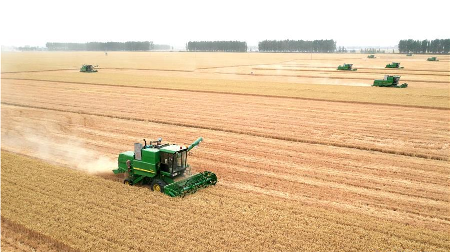 “三夏”時節(jié),中原大地一片金黃。位于河南省周口市的黃泛區(qū)農(nóng)場機聲隆隆,10萬畝小麥?zhǔn)斋@正酣。