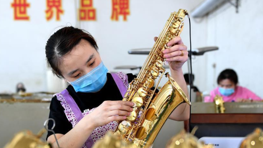 6月2日,工人在武強縣一家樂器廠生產(chǎn)車間內(nèi)組裝薩克斯。