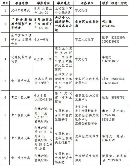 活動期間,全市將舉辦25項(xiàng)全市性重要活動,分為6項(xiàng)活動,19項(xiàng)比賽。其中,6項(xiàng)活動為開幕式、“行走鵬城 感受深圳”惠民活動、全市勞務(wù)工讀書成才巡回報(bào)告會、來深青工文體節(jié)回顧圖片展、閉幕式及優(yōu)秀獲獎(jiǎng)節(jié)目展演;19項(xiàng)比賽活動分別是來深青工歌手大賽(全國)、才藝大賽、攝影大賽(全國)、美術(shù)大賽、書法大賽、知識競賽、演講比賽、打工文學(xué)大賽(全國)、羽毛球混合團(tuán)體賽、跳繩比賽、乒乓球競賽、趣味體育比賽、拔河比賽、三人籃球賽、業(yè)余定向賽競賽、登山比賽、棋類挑戰(zhàn)賽、趣味沙灘排球比賽、廣場健身操比賽。參賽對象主要為在深工作的18至50歲非深戶籍人士(不包括在各類文化演藝公司、培訓(xùn)機(jī)構(gòu)中從事文藝表演、培訓(xùn)的專業(yè)人員)。