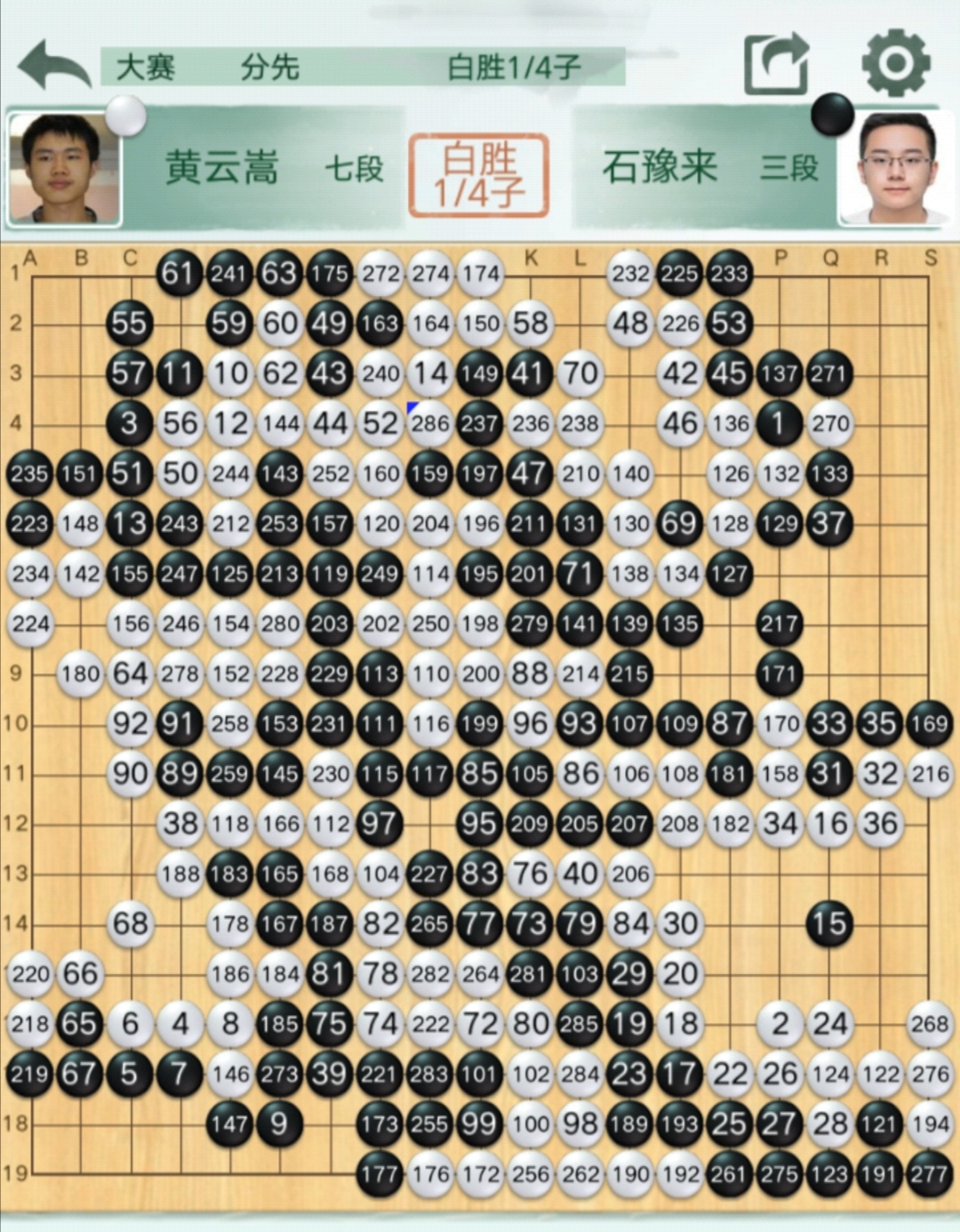 緊接著,連勝柁嘉熹、連笑兩位頂尖九段的石豫來三段執(zhí)黑對(duì)黃云嵩七段,雙方大戰(zhàn)286手,局面細(xì)膩,勝負(fù)天平一直在左右擺晃,收官時(shí)石豫來出現(xiàn)了致命的失誤,最終小石以四分之一子惜敗于黃云嵩。