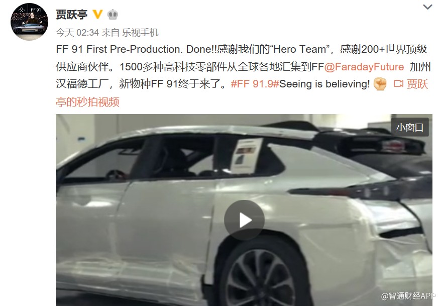 他在微博中寫道“感謝FF的‘Hero Team’,感謝200+世界頂級(jí)供應(yīng)商伙伴,1500多種高科技零部件從全球各地匯集到FF加州漢福德工廠,新物種FF91終于來(lái)了?!?/p>