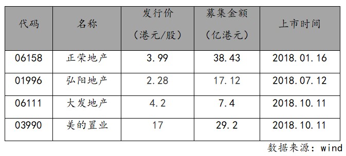 智通財經(jīng)APP獲悉,10月11日,大發(fā)地產(chǎn)(06111.HK)、美的置業(yè)(03990.HK)同時在港交所成功掛牌上市,加上此前于1月份上市的正榮地產(chǎn)(06158.HK),7月份上市的弘陽地產(chǎn)(01996,HK),2018年港股上市內(nèi)地房地產(chǎn)企業(yè)增至四家,共計募資金額為92.15億港元。