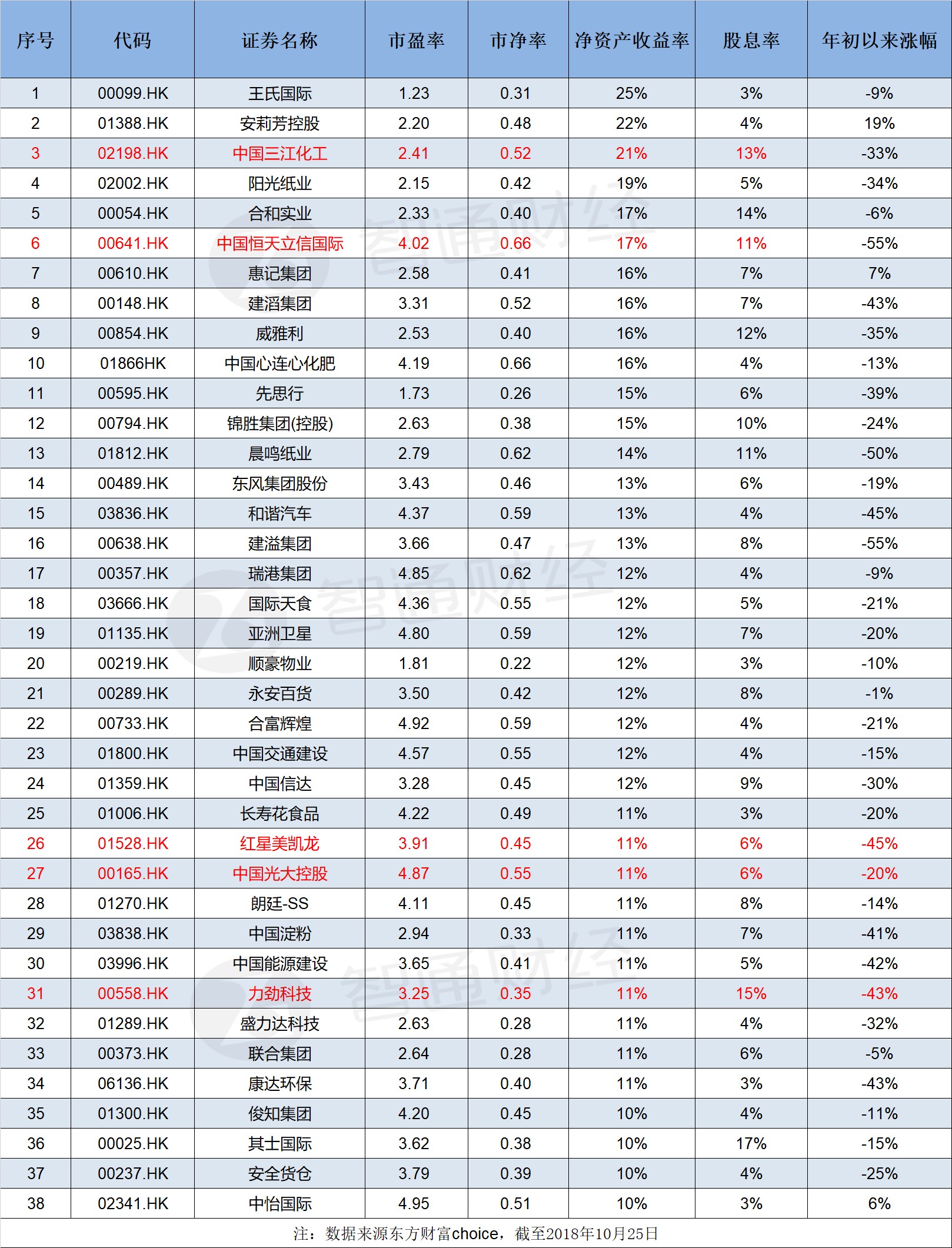 圖表顯示,截止2018年10月25日,從ROE指標(biāo)來看,指標(biāo)比較居前的公司有安莉芳(01388)、中國三江化工(02198)、合和實(shí)業(yè)(00054)。其中,中國三江化工為ROE及股息率雙高個(gè)股。