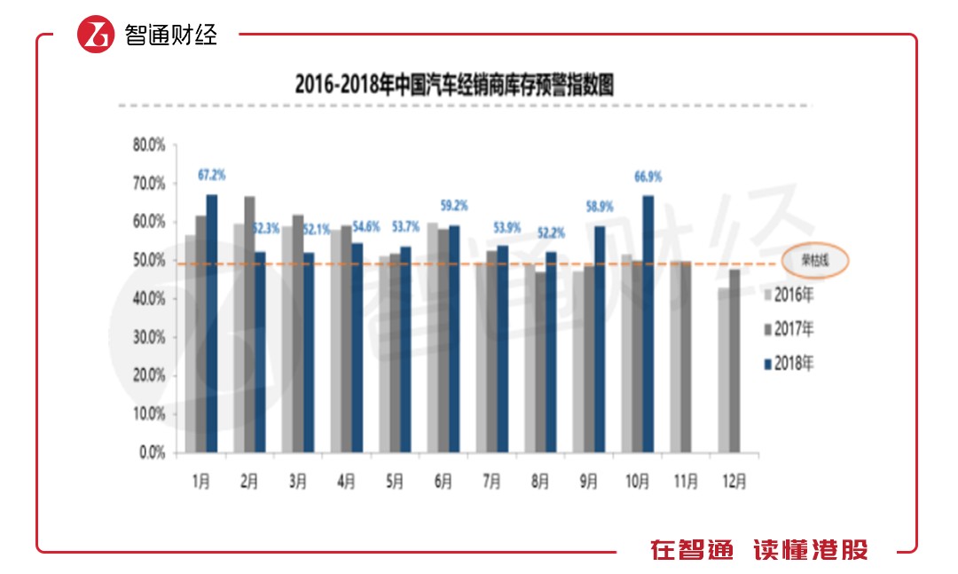 實際上,從汽車制造到最終消費者,流通過程要通過經(jīng)銷商,中汽協(xié)近日公布了經(jīng)銷商庫存預(yù)警指數(shù),顯示下半年以來,庫存預(yù)警指數(shù)均高于前兩年,10月份創(chuàng)出新高,預(yù)警指數(shù)達66.9%,而榮枯線為50%,汽車庫存堪憂,未來兩個月消化難度依然很大。