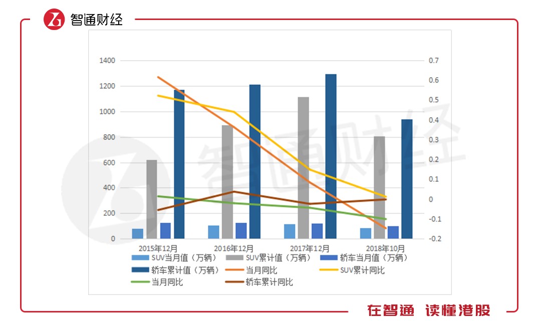 在乘用車車型中,2015年以來,SUV當月及當年累計銷量增長呈過山車式下滑,從2015年的61.5%和52.2%下滑至2018年10月份的-14.7%和1.2%,而轎車一直保持著負增長的態(tài)勢。以SUV車型為主的車企,首當其沖的是長城汽車,2018年首10月,其SUV銷量下滑了5.91%,哈弗SUV銷量下滑17.08%。