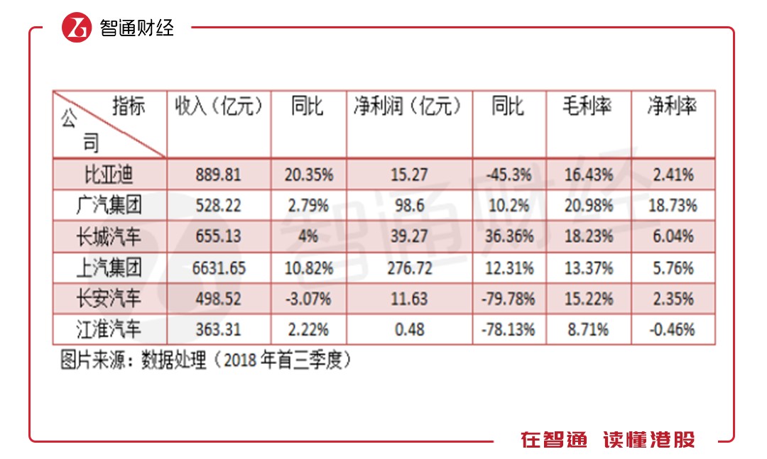 從抽樣的標的看,2018年首三季度比亞迪(01211)的收入增速是最快的,其次是上汽集團,其余標的增速單位數(shù)甚至是負增長,在此次標的中,沒有自主品牌龍頭吉利汽車(00175),不過以該公司上半年的收入增速看,和比亞迪是同一個高增長賽道。在盈利上,各個車企差異還是挺大的,不過,在這塊操作靈活性較大。