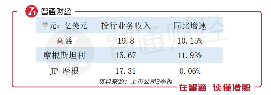 對于投行業(yè)務(wù),三家華爾街老牌券商規(guī)模相近,其中高盛最高,而JP摩根的同比增速最慢。