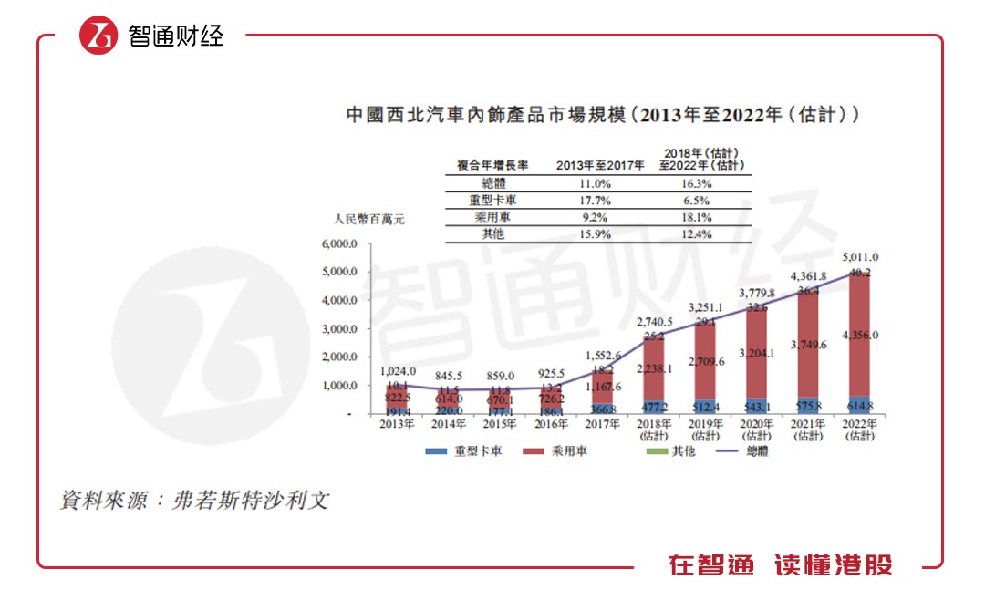 智通財(cái)經(jīng)APP進(jìn)一步查閱天瑞招股說(shuō)明書發(fā)現(xiàn),從行業(yè)來(lái)看中國(guó)汽車內(nèi)飾產(chǎn)品市場(chǎng)的總值由2013年的435.7億元增至2017年的620.4億元,復(fù)合年增長(zhǎng)率為9.2%。估計(jì)市場(chǎng)規(guī)模將于2022年達(dá)到942.39億元,2018年至2022年期間的復(fù)合年增長(zhǎng)率為8.4%。