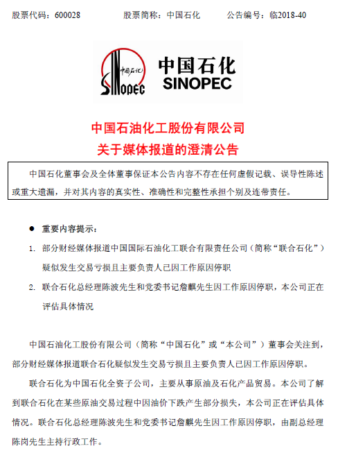 智通財(cái)經(jīng)APP獲悉,中國(guó)石化今日(12月27日)晚間在上交所發(fā)表公告稱,了解到聯(lián)合石化在某些原油交易過程中因油價(jià)下跌產(chǎn)生部分損失,公司正在評(píng)估具體情況。聯(lián)合石化總經(jīng)理陳波先生和黨委書記詹麒因工作原因停職,由副總經(jīng)理陳崗主持行政工作。此外,中國(guó)石化還表示,目前公司生產(chǎn)經(jīng)營(yíng)情況一切正常。(林雅蕓)