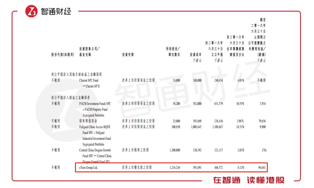 值得一提的是,中民金融的重大投資中,其于今年4月份才投資的eToro,截至2018年上半年期間的公平值變動(dòng)未變現(xiàn)損益為9468萬港元,而該項(xiàng)投資僅占其資產(chǎn)總值的8.12%。