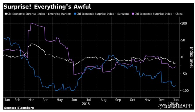 兩位分析師表示,歐洲和新興市場的經(jīng)濟驚喜指數(shù)均陷入負值區(qū)間。而標普500指數(shù)成份股公司約有三分之一的營收來自海外,海外市場的進一步疲軟可能最終會令美國國內(nèi)的增長前景變得黯淡。此外,美國國內(nèi)的經(jīng)濟增長前景在一定程度上也已經(jīng)因美國政府部分關門而減弱。