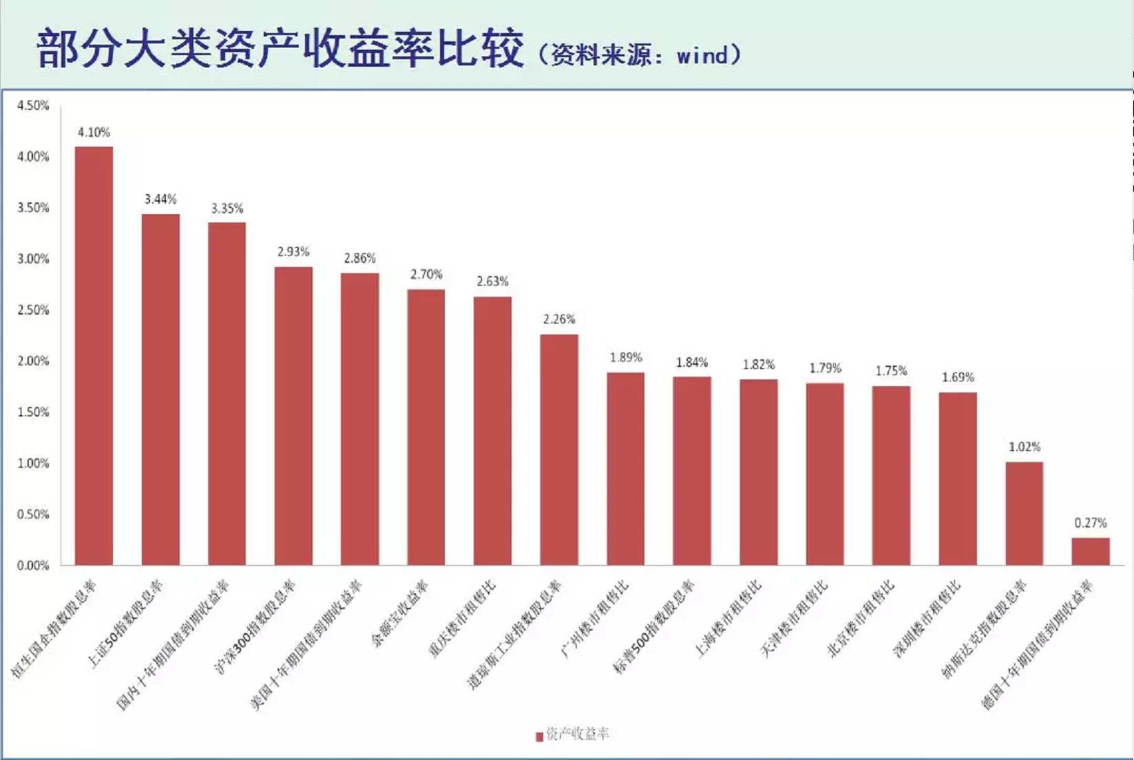 買恒生國企可以有4.1%的收益率,上證50有3.44%的收益率,10期國債是3.14%的收益率,然而,買上海、北京的房產(chǎn),收益率分別是1.82%、1.75%,買深圳的房產(chǎn)收益率更是只有1.69%。作為對比,余額寶的收益率都有2.7%。