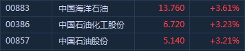 智通財經APP獲悉,受國際原油價格持續(xù)走高刺激,港股石油股全線大漲。截至9時55分,中海油(00883)漲3.61%,報價13.76港元,中石化(00386)漲3.23%,中石油(00857)漲3.21%。