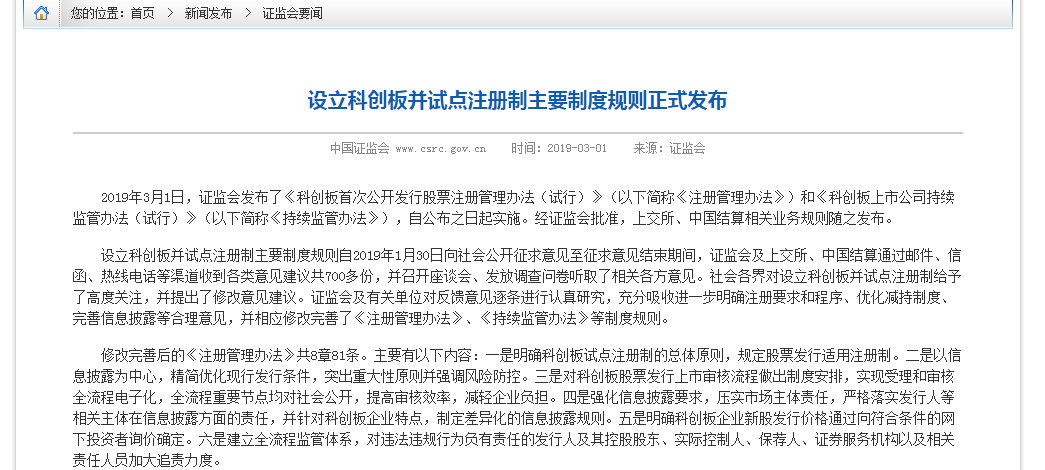 3月1日晚間,中國(guó)證監(jiān)會(huì)、上海證券交易所正式發(fā)布設(shè)立科創(chuàng)板并試點(diǎn)注冊(cè)制的主要制度規(guī)則。這表明,經(jīng)過(guò)一個(gè)月的意見(jiàn)征集,市場(chǎng)高度關(guān)注的科創(chuàng)板正式開閘。要點(diǎn)總結(jié)如下: