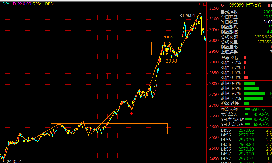 可以很明顯的看出,這是一波五分鐘級別的雙中樞上漲,這波上漲隨著周五尾盤跌入2995點結束。市場在后續(xù)的演化過程中會做出選擇:開始五分鐘級別下跌趨勢,或者圍繞著五分鐘上漲趨勢的最后一個中樞進行行情級別擴張。不論哪種情況,從纏論的視角,短期這輪上漲趨勢暫告一段落,3129.94點即是五分鐘趨勢的第一類賣點,在下周,市場企穩(wěn)后,大概率會上沖構建第二類賣點。