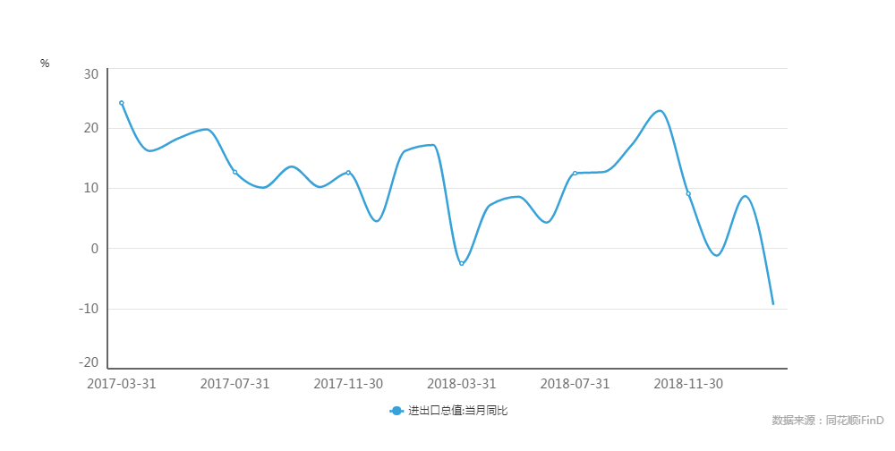 同時,進出口數(shù)據(jù)持續(xù)低迷。中國海關總署3月8日公布數(shù)據(jù)顯示,2019年2月,我國進出口總值2663.6億美元,同比增長-13.8%。其中出口1352.4億美元,同比增長--20.7%;進口1311.2億美元,同比增長-5.2%。