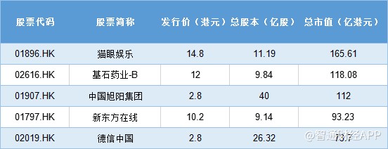 據(jù)智通財(cái)經(jīng)APP統(tǒng)計(jì),按上市時(shí)的總股本計(jì)算,一季度的新股整體體量較小,普遍總市值在50億港元以下,僅三只新股總市值超過(guò)百億,分別為貓眼娛樂(lè)、基石藥業(yè)-B、中國(guó)旭陽(yáng)集團(tuán)。其中,貓眼娛樂(lè)以165.61億港元的總市值,成為一季度的最重磅股。