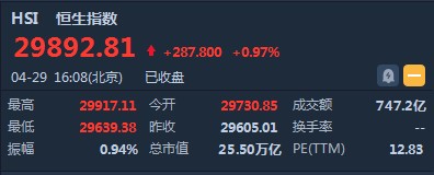智通財經(jīng)APP獲悉,恒指早盤高開125.84點(diǎn)或0.43%,報29730.85點(diǎn)。截至收盤,恒生指數(shù)漲287.8點(diǎn)或0.97%,報29892.81點(diǎn),全日成交額達(dá)747.22億。國企指數(shù)漲1.11%,報11638.18點(diǎn),紅籌指數(shù)漲0.83%,報4620.34點(diǎn)。