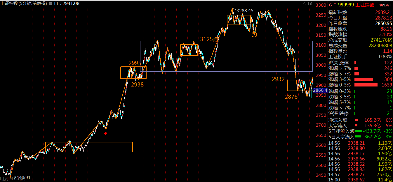 再看5分鐘級別走勢結構,在特朗普的幫助下,這里直接跌穿了三月份構建的三十分鐘級別中樞,力度較大。周五逆轉趨勢后,在三十分鐘中樞下面,完成了這段下跌趨勢第二個五分鐘中樞的構建工作。大概率宣告了這段五分鐘下跌趨勢的終結。下周一、周二,上證指數(shù)面臨了上方30分鐘中樞下軌2968點的反壓,可能會出現(xiàn)回落,投資者可逢低吸納。