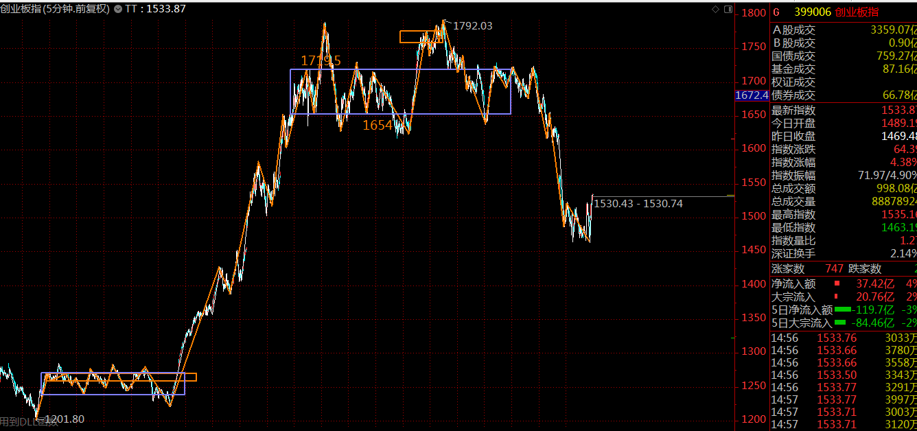 創(chuàng)業(yè)板這里走勢結構粗暴直接的多,目前已遠離上方的三十分鐘中樞,壓力位在上方中樞下沿1616點附近,空間較大。相對來說,短期小票走勢可能會強一些。