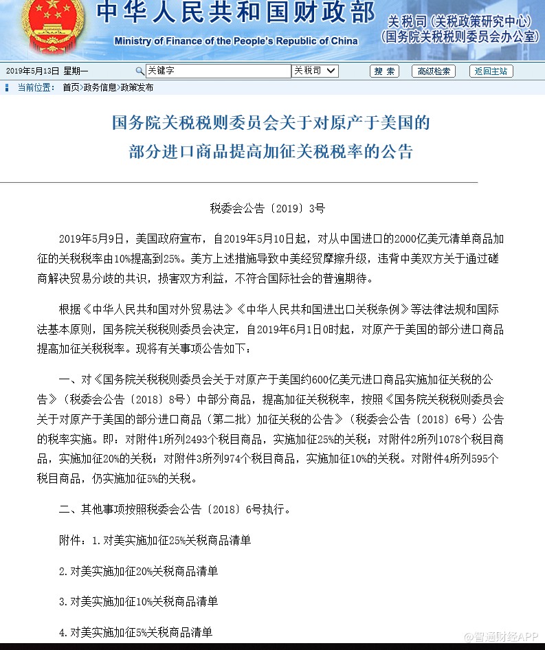 智通財經(jīng)APP獲悉,據(jù)財政部官網(wǎng)消息,2019年5月9日,美國政府宣布,自2019年5月10日起,對從中國進口的2000億美元清單商品加征的關稅稅率由10%提高到25%。美方上述措施導致中美經(jīng)貿(mào)摩擦升級,違背中美雙方關于通過磋商解決貿(mào)易分歧的共識,損害雙方利益,不符合國際社會的普遍期待。