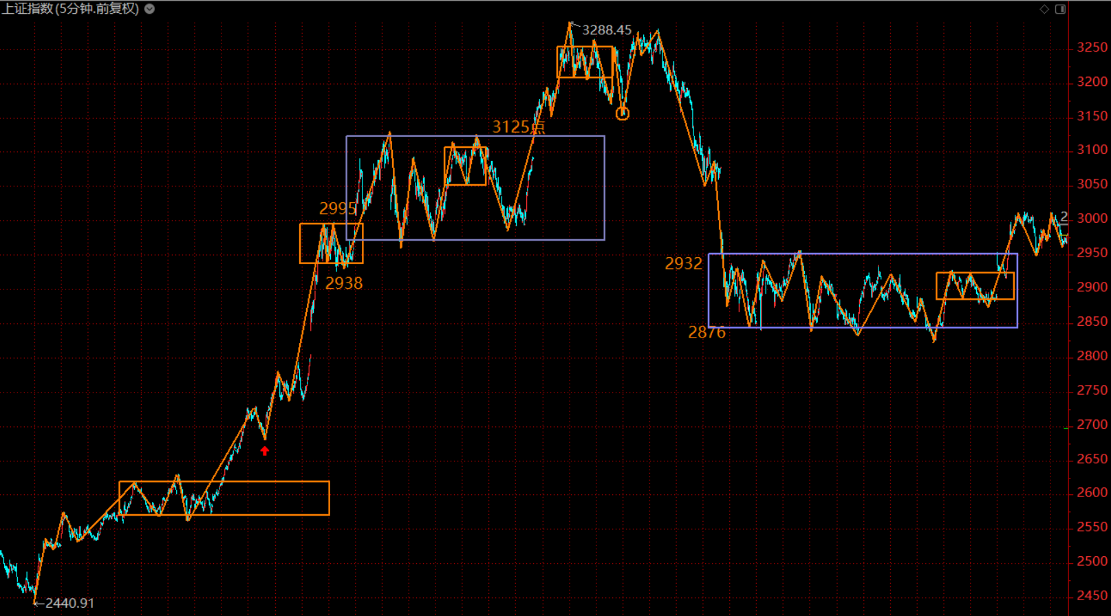 下圖為上證指數(shù)五分鐘級別走勢結(jié)構(gòu)。從走勢結(jié)構(gòu)上看,這里走出標準30分鐘級別第三類買點,本周有望往上繼續(xù)拓展,甚至回補3050點缺口。同時,我們也關(guān)注到,這個位置形成了5分鐘上漲段的第二個中樞,本周的上漲很有可能會形成趨勢背馳。因此,本周的大方向應該為持股待漲,越長越賣。在滬指回補缺口過程中,完成降倉。