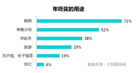在年終獎的使用上,71%的人會用于購物,52%的人會用于孝敬父母,38%的人會將年終獎存一部分起來,29%的會用于旅行。超過一半的人,以上年終獎的使用類別超過了3項,人生的那點小夢想,全仰仗年終獎。“平時每個月還完房貸,收入只夠生活,提升生活質(zhì)量,全靠年終獎,去年的年終獎,我給自己買了臺蘋果筆記本電腦;今年的年終獎,準(zhǔn)備用來去普吉島旅行,沒有年終獎肯定要哭死?!?剛在上海買了房的小杰告訴我們。